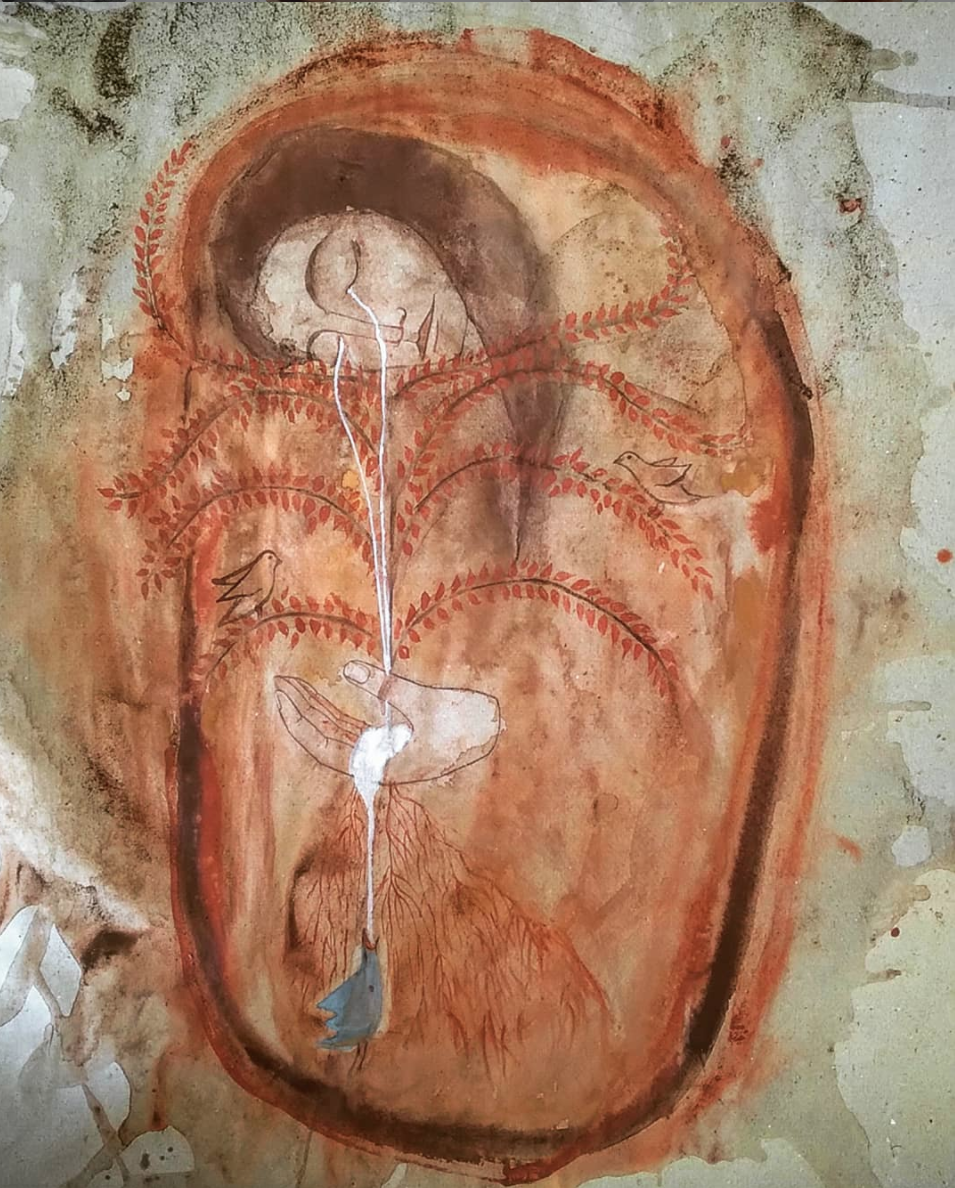 Mirella Salamé, “Inner spring does come even when it is not spring,” earth and plant pigments and watercolors on recycled wood, image courtesy of and copyright Mirella Salamé